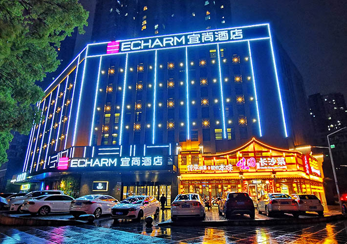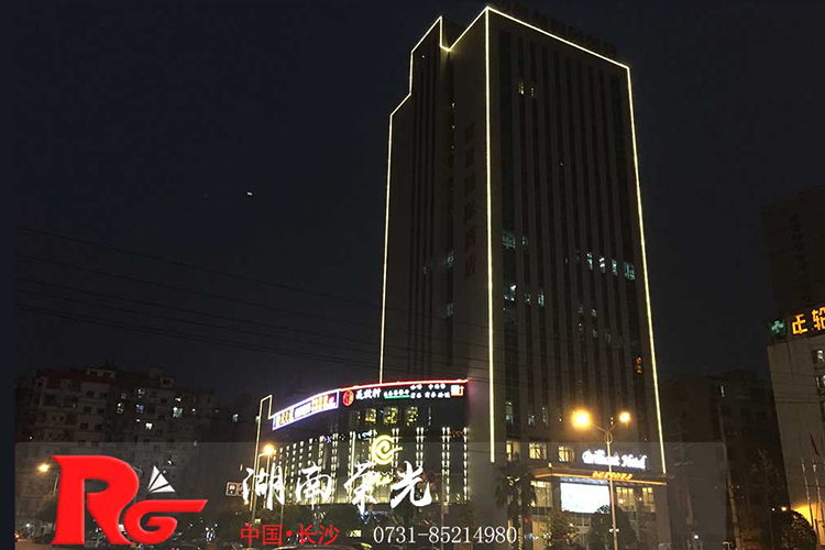 長沙酒店亮化 戶外亮化設(shè)計 LED夜景亮化安裝及施工工程采用IP 65防護(hù)等級的LED線條燈,十字星光燈搭配設(shè)計。燈具色溫采用冷、暖色搭配設(shè)計,主線條燈勾勒出建筑亮化的輪廓,采用暖色星光燈營造長沙酒店亮化的溫馨氛圍。